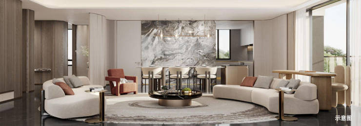 U型明厨,结合餐厅区和岛台布置,餐客一体墅质礼序