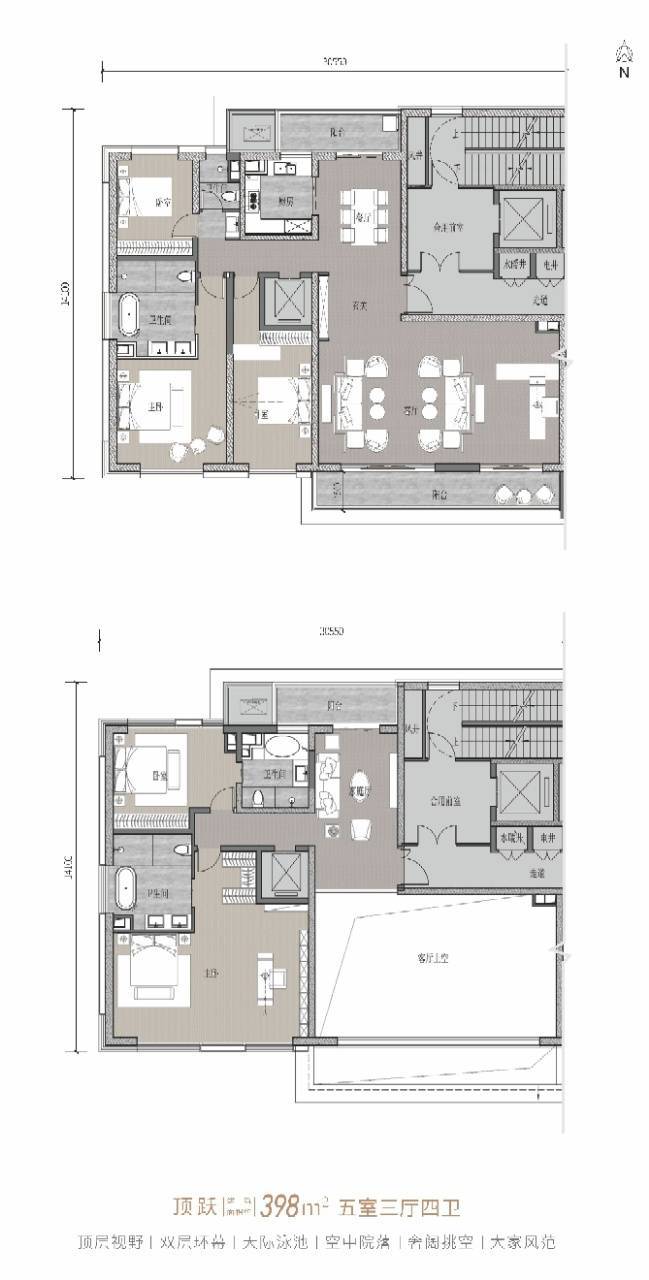 约5米高架空层社交空间,全龄互动花园、中西双式专属会客厅、私家泳池,打造圈层生活。