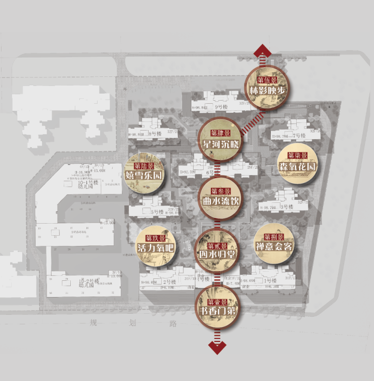 项目整体景观呈现“一轴、双芯、多院落”布局形式,融合东方造园理念与城市人文特色,在园林设计上打造五进制归家院落,以山水自然“入画”,营造丰富自然景观及互动空间。从入口礼序、邻里社交、层叠景观到入户私境,用自然笔触描绘生活的诗意,于森境居所中回归生活本色。