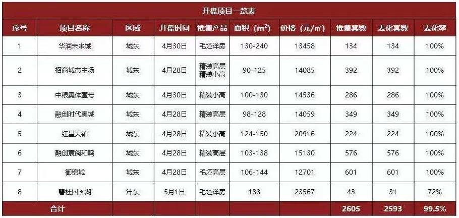 这8个盘,累计推出房源2605套,均价在1.27-2.35万/㎡,开盘认购2593套,总体认购去化率99.5%,达到近期新高!