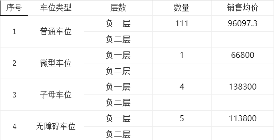 本次开盘全部可售车位121个,总面积3801.17㎡,本次开盘销售的全部可售产权车位均价97981.82元/个,各类型车位销售均价及数量明细如下: