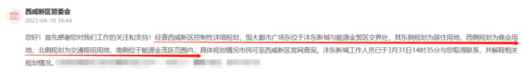 对此疑问,官方四月给出的回复是:其东侧规划为居住用地,西侧规划为商业用地,北侧规划为交通枢纽用地,南侧位于能源金茂区范围内。