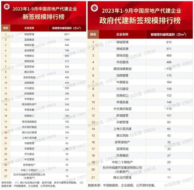 近日,中指研究院发布了《2023年1-9月中国房地产代建企业排行榜》,则分别从新签规模、政府代建新签规模、以及代建销售规模和优秀代建项目等四个方面,对代建房企做了全面的统计排名。