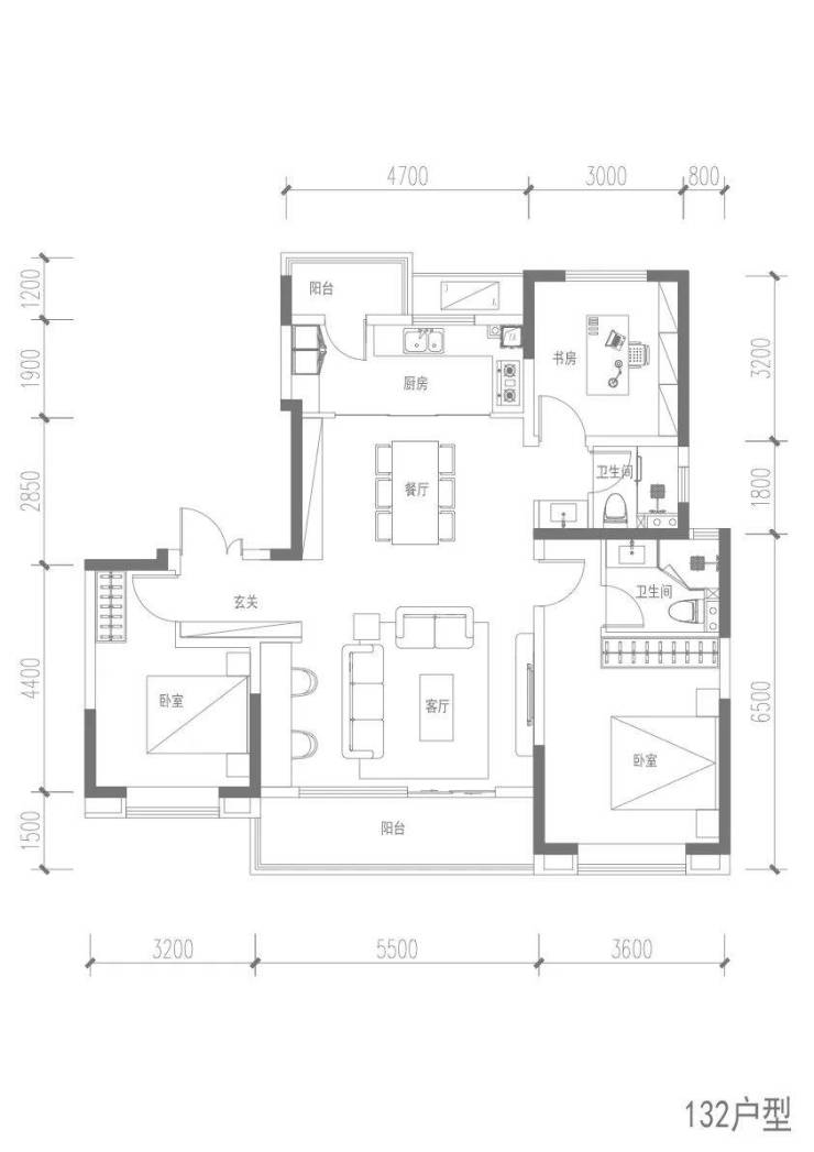 建面约132㎡的户型同样为横厅、南北双阳台设计,三室两厅两卫,南向开间达约12.3米,客厅面宽约5.5米,空间开阔采光充足;另外,该户型得房率超过80%,惊喜满满。
