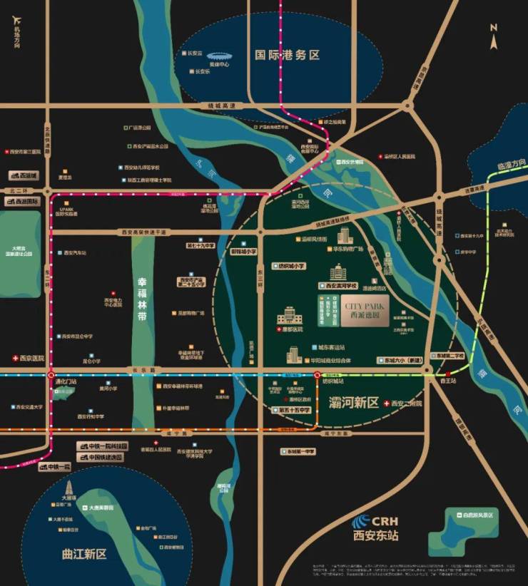 除此之外,西安东部区域可凭借这个重大工程,促进产业、资金、人才等向这里集聚,区域发展蝶变指日可待。从城市发展的角度来看,这里将打造出一个集合枢纽引领、门户开放、站城一体化的新型都市区。正是基于对城东区域发展的信心,嗅觉灵敏的开发商们才集中布局于此,助力区域人居品质的进一步升级。中国铁建·西派逸园,就是最具代表性的优等生。中国铁建·西派逸园项目处于城东核心位置,周边有1号线、6号线、9号线以及7号线(规划)四条地铁线路,交通便捷。