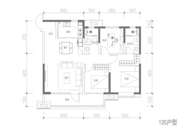 另一个建面约120㎡的户型,三室两厅两卫设计,南北通透。LDKB一体化设计,将客厅、餐厅、厨房、阳台共处一个开放空间,面积达约 40 ㎡;约4.6 米宽尺客厅,视野开敞,空间舒展。
