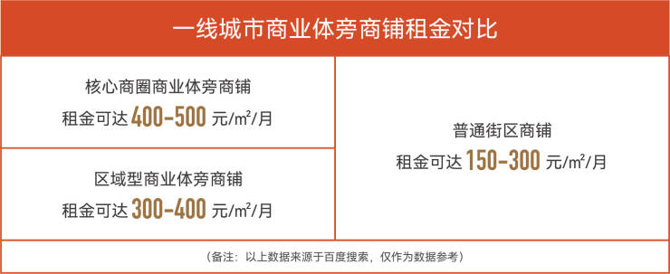 商业体旁商铺通常能共享商业体带来的大量客流,一般来说,商业体旁商铺租金为普通商铺的2-3倍左右。
